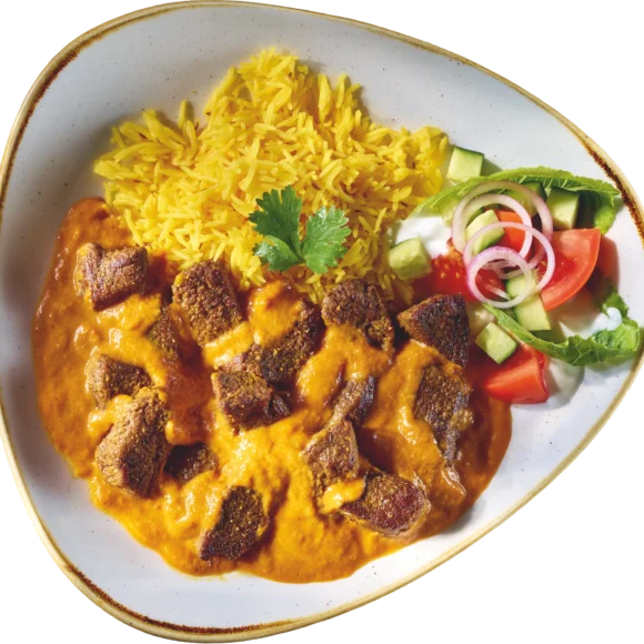 Heerlijke stukjes rundvlees in een pittige kokos-currysaus, geserveerd met basmatirijst.