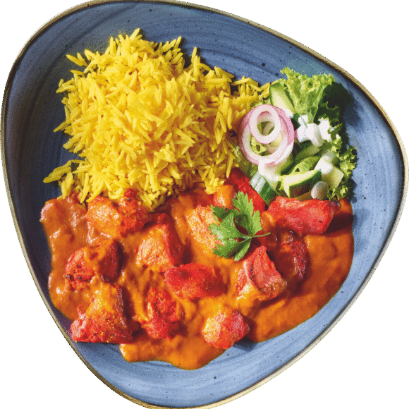 Een Indiaas gerecht met malse stukjes tandoori kip in een rijke tomaat-botersaus. Geserveerd met rijst en salade.