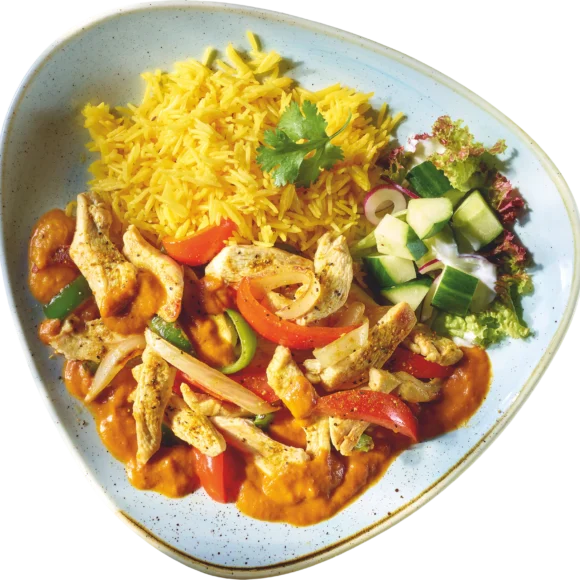 Malse kipfilet in een pittige currysaus met paprika, ui en verse tomaten, geserveerd met basmatirijst.