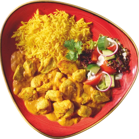 Malse kipfilet met champignons in een heerlijke currysaus, geserveerd met basmatirijst.