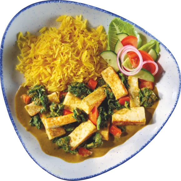 Romige spinazie met Indische kaas in een lichte tomatensaus, geserveerd met basmatirijst.