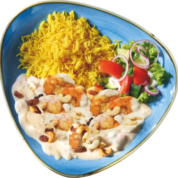 Scampi’s in een romige kormasaus, geserveerd met basmatirijst.
