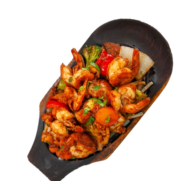 Gekruide scampi’s met garnalen, bereid in een tandoor, geserveerd met diverse groenten en basmatirijst.